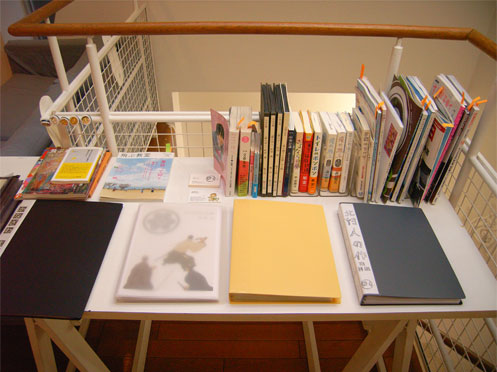 二階の机には二人のお仕事した書物や作品ファイルが置いてあります。